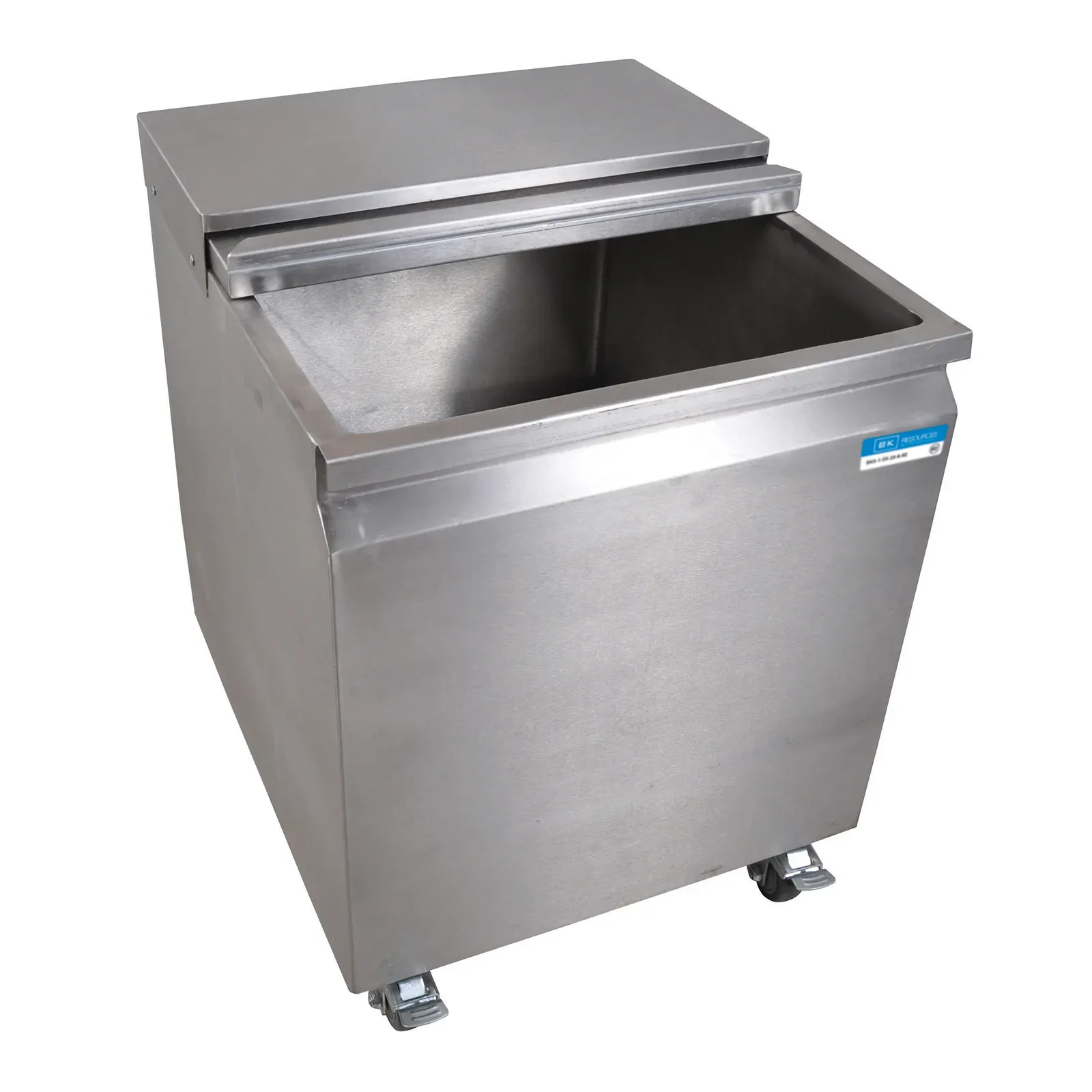 Elevate your dining experience with the BK Resources BK-MIB-2422 Ice Bin / Ice Caddy. This mobile ice bin is designed to meet the demands of a busy commercial restaurant. Made of durable stainless steel, it ensures long-lasting performance and easy cleaning. With a generous 117lb. capacity, you can store plenty of ice to keep your beverages chilled throughout the day. The sliding lid allows for easy access while keeping the ice protected and sanitary. The removable bottom tray makes cleaning a breeze, and the drain valve in the rear of the unit ensures efficient water removal. Equipped with 3" casters with brakes, this ice bin is easy to maneuver and secure in place. Whether you're running a bustling bar or a high-volume restaurant, the BK Resources BK-MIB-2422 Ice Bin / Ice Caddy is a must-have for keeping your drinks cool and your customers satisfied.