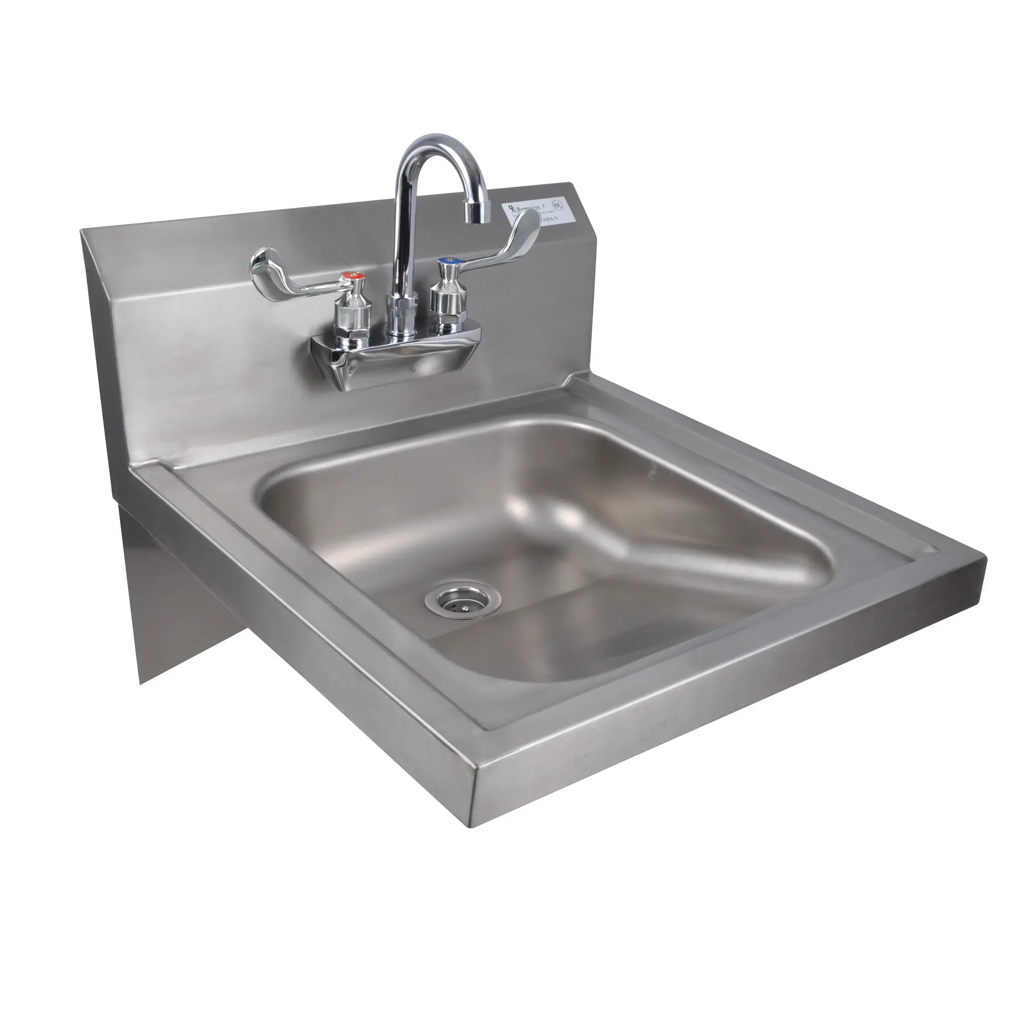 Fuel your restaurant's success with the BK Resources BKHS-ADA-S-P-G Hand Sink. This ADA-compliant sink is designed to meet the needs of commercial restaurants, ensuring accessibility and convenience for all users. The 14" wide x 16" front-to-back x 5" deep bowl provides ample space for handwashing, while the 8" backsplash and marine edge help contain water and prevent spills. The sink is made of 18/304 stainless steel, ensuring durability and resistance to corrosion. It comes with a 4" OC splash mount faucet with a 3-1/2" gooseneck spout and wrist blade handles, providing easy control of water flow. The sink also includes a basket drain and wall bracket for easy installation. With its high-quality construction and user-friendly features, the BK Resources BKHS-ADA-S-P-G Hand Sink is the perfect addition to any commercial restaurant.