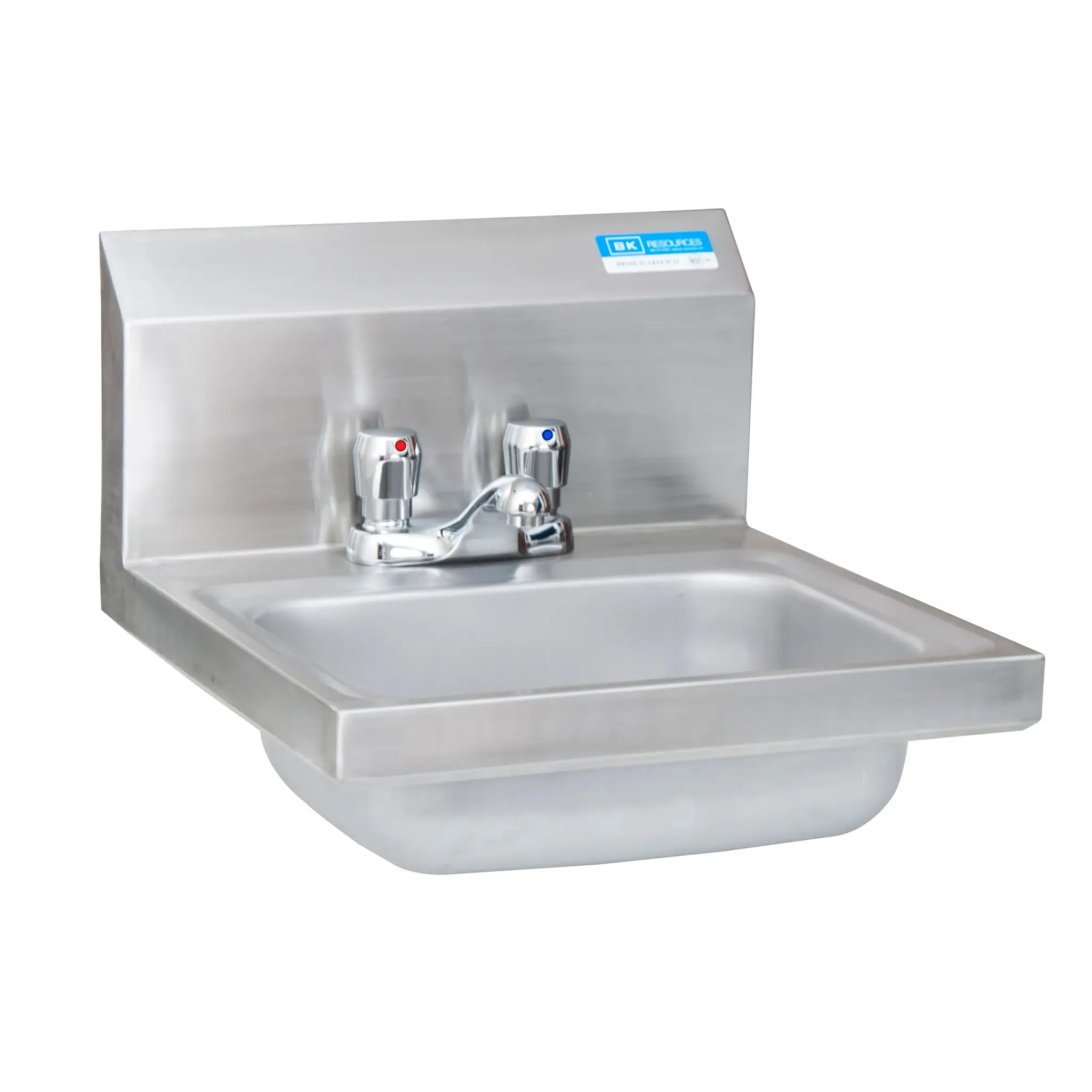 Master your restaurant's kitchen with the BK Resources BKHS-D-1410-4MF Hand Sink. This wall-mounted sink is designed to optimize space in your commercial kitchen while providing convenience and functionality. The 14" wide x 10" front-to-back x 5" deep bowl is perfect for quick handwashing, ensuring proper hygiene for your staff. The sink features a 4" OC deck mount with an MF-4D-G metering faucet, allowing for easy control of water flow. The color-coded hot and cold indicators make it simple to adjust the water temperature to your preference. The 1-7/8" basket drain with a crumb cup helps to prevent clogs and keeps your sink clean. Made of durable 304 stainless steel, this hand sink is built to withstand the demands of a busy restaurant environment. NSF certified, you can trust the quality and safety of this BK Resources hand sink. Upgrade your kitchen with this reliable and efficient hand sink.