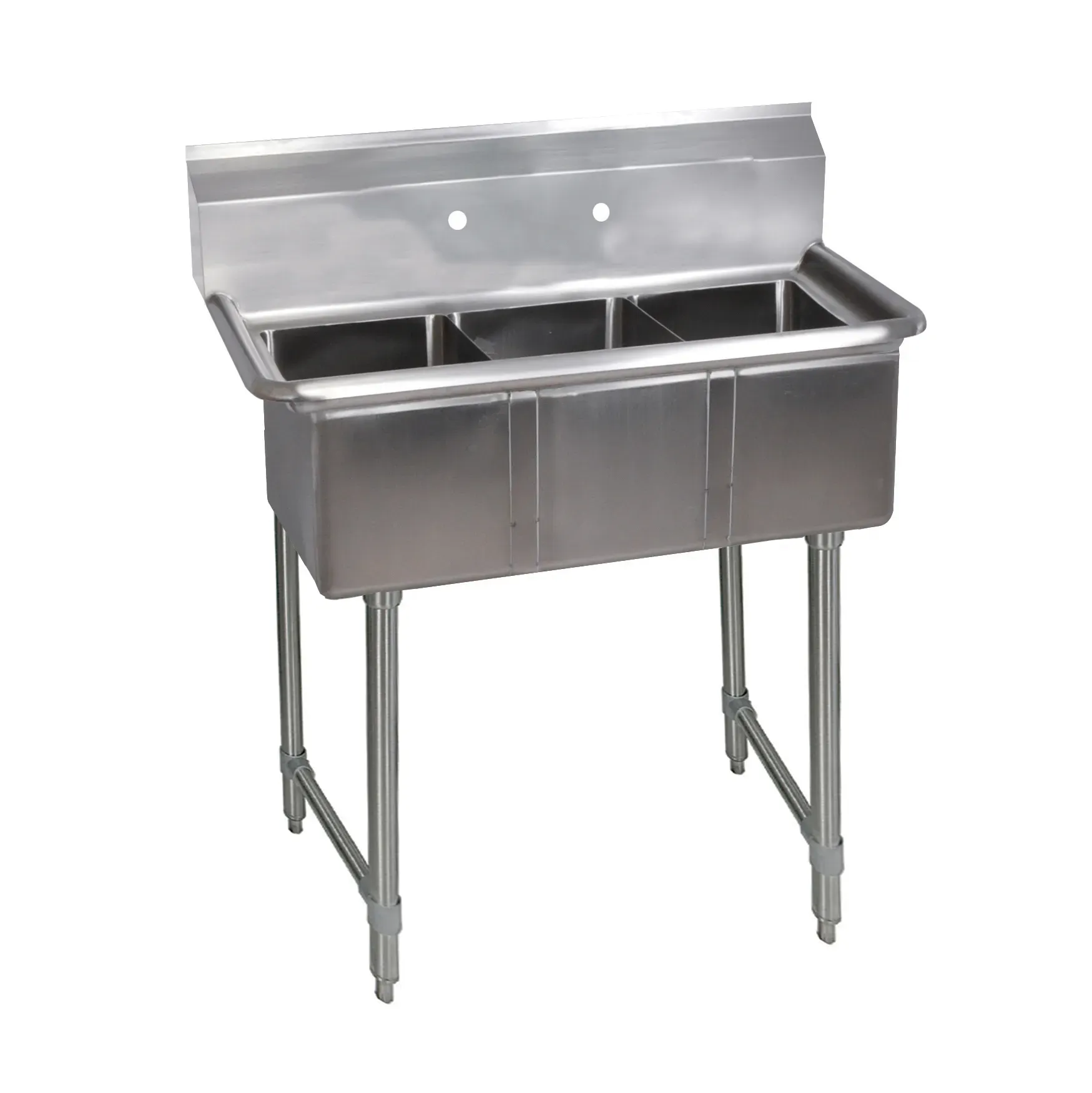 Cook with confidence with the BK Resources, BKS-3-1014-10S Sink, (3) Three Compartment. This convenience store sink is designed to meet the demands of a busy commercial restaurant. With its three compartments, measuring 10" wide x 14" front-to-back x 10" deep, you'll have plenty of space to wash and rinse dishes efficiently. The sink features a 9" backsplash and 8" OC splash mount faucet holes, ensuring a clean and sanitary workspace. The 1-1/2" rolled edges on the front and sides add durability and prevent spills. Made of 18/304 stainless steel, both the deck and bowl are built to withstand heavy use. The stainless steel legs and side crossbracing provide stability, while the adjustable bullet feet allow for easy leveling. With its NSF certification, you can trust the quality and cleanliness of this sink. Upgrade your restaurant's kitchen with the BK Resources, BKS-3-1014-10S Sink, (3) Three Compartment and experience the convenience and reliability it offers.