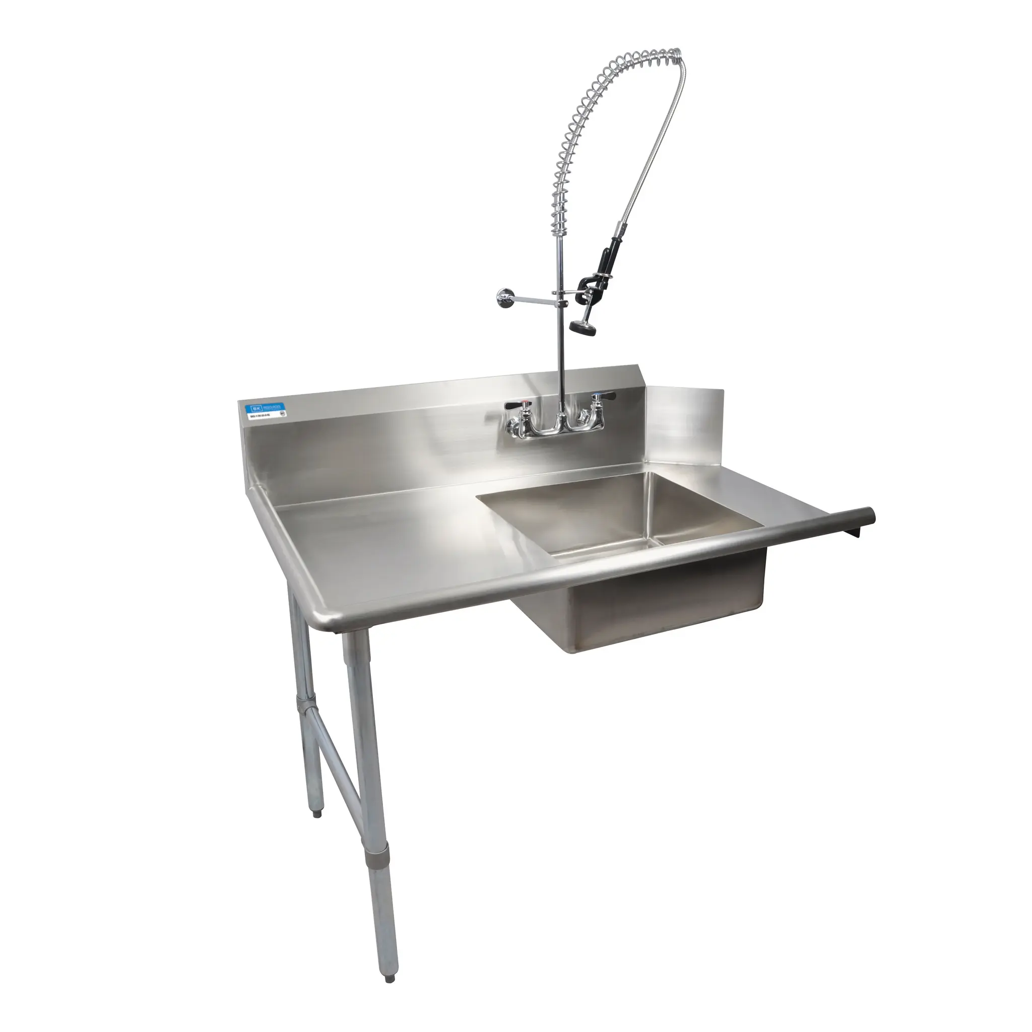 Enhance the heart of your restaurant with the BK Resources BKSDT-26-L-SS-P-G Soiled Dishtable. This straight design dishtable is specifically designed for commercial restaurant use, providing a convenient and efficient solution for handling soiled dishes. Made with high-quality 18/304 stainless steel, this dishtable is built to withstand the demands of a busy kitchen. It features a spacious 26"W x 30-3/8"D x 46-1/4"H size, allowing for ample workspace. The left-to-right operation ensures smooth workflow and easy access to the pre-rinse sink. Speaking of which, the dishtable comes with a 20" x 20" x 8" deep pre-rinse sink and an 8" OC splash mount pre-rinse faucet, making it easy to rinse off food debris before washing. The 10"H backsplash and raised rolled edges on the front and sides help contain splashes and prevent water from spilling onto the floor. The dishtable also includes a basket drain for efficient water drainage. With stainless steel legs and side bracing, as well as stainless steel over plastic adjustable bullet feet, this dishtable is sturdy and stable. It is NSF certified, ensuring its compliance with health and safety standards. Upgrade your restaurant's dishwashing area with the BK Resources BKSDT-26-L-SS-P-G Soiled Dishtable.