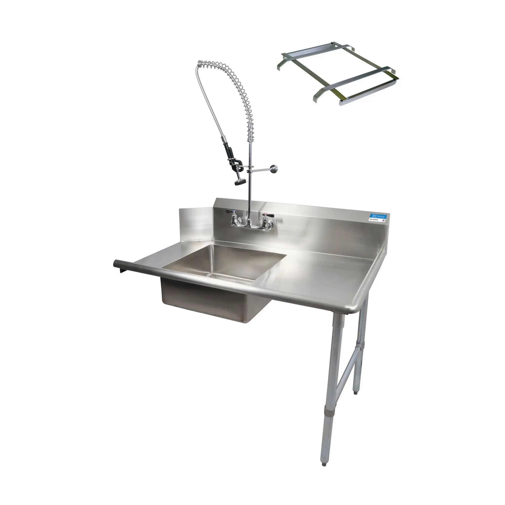 Take your kitchen to the next level with the BK Resources BKSDT-26-R-SS-P2-G Dishtable. This soiled dishtable is designed to enhance the efficiency and functionality of your commercial restaurant. Made with high-quality 18/304 stainless steel, it features a straight design with raised rolled edges on the front and sides for added durability. The 26"W x 30-3/8"D x 46-1/4"H size is perfect for busy kitchens, and the right-to-left operation ensures smooth workflow. The dishtable includes a 20" x 20" x 8" deep pre-rinse sink and an 8" OC splash mount pre-rinse faucet for convenient cleaning. With a 10"H backsplash and stainless steel legs and side bracing, this dishtable is built to withstand the demands of a commercial kitchen. It also comes with a basket drain for easy maintenance. Upgrade your kitchen with the BK Resources BKSDT-26-R-SS-P2-G Dishtable and experience improved efficiency and cleanliness.