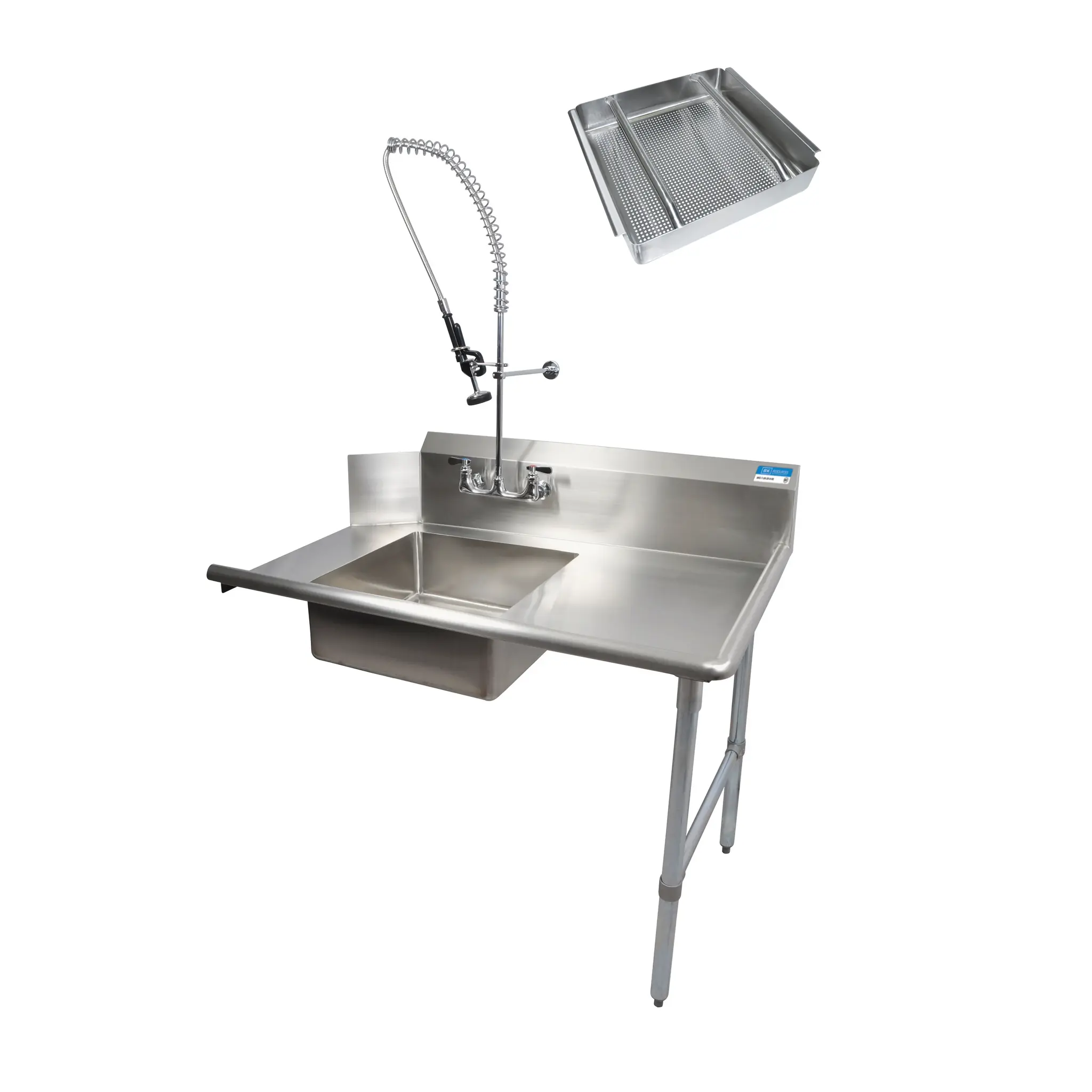 Equip your kitchen for success with the BK Resources BKSDT-26-R-SS-P3-G Soiled Dishtable. This straight design dishtable is perfect for commercial restaurant use, offering a convenient and efficient solution for handling soiled dishes. Made with high-quality 18/304 stainless steel, this dishtable is built to withstand the demands of a busy kitchen. It features a 20" x 20" x 8" deep pre-rinse sink, complete with an 8" OC splash mount pre-rinse faucet for easy cleaning. The 10" high backsplash and raised rolled edges on the front and sides help contain any spills or splashes, keeping your kitchen clean and organized. The dishtable also includes a pre-rinse basket and basket drain for added convenience. With stainless steel legs and side bracing, as well as adjustable bullet feet, this dishtable is stable and sturdy. NSF certified, this BK Resources dishtable is a reliable and essential addition to any commercial kitchen.