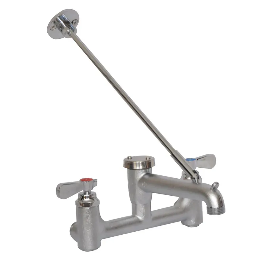 Equip your commercial kitchen with the BK Resources BKSF-WB3 Faucet, Service Sink. This high-quality service faucet is designed to meet the demands of a busy restaurant environment. With its splash-mounted design and integral check valves, it ensures efficient and reliable operation while preventing water waste. The 1/4 turn ceramic valves provide smooth and precise control, allowing you to easily adjust the water flow and temperature. The built-in bucket holder is a convenient feature that keeps your cleaning tools within reach, saving you time and effort. Additionally, the garden hose threaded spout allows for easy connection to a hose for added versatility. The BKSF-WB3 comes with a wall bracket included, making installation a breeze. Trust BK Resources, a reputable vendor in the industry, to provide you with a durable and functional faucet that will withstand the rigors of a commercial kitchen.