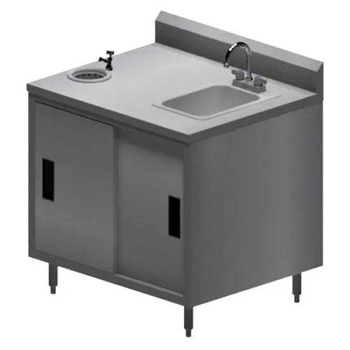 Create culinary magic with the BK Resources MOD-IC Work Table and Cabinet Base Sliding Doors. This versatile and durable work table is perfect for commercial restaurant use. It features a 36"W x 30"D 14/304 stainless steel top and an 18/304 stainless steel body, ensuring long-lasting performance in a busy kitchen environment. The sliding doors provide easy access to the cabinet base, allowing for convenient storage of ingredients, utensils, and equipment. The 5" riser top adds extra workspace, while the included drop-in sink with faucet and dipper well with faucet make food preparation and cleanup a breeze. With its adjustable legs and NSF certification, this work table is designed to meet the highest standards of hygiene and functionality. Trust BK Resources, a reputable vendor in the industry, to deliver a reliable and efficient solution for your restaurant needs.