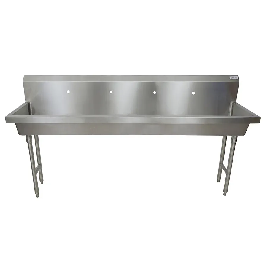 Cook with precision using the BK Resources MSHS-96F1 Handwash Sink. This freestanding sink is designed for commercial restaurant use, offering four station handwashing capabilities. With four single hole splash mount faucet holes, this sink provides convenience and efficiency for your kitchen staff. The 96-inch width and 19-7/8-inch front-to-back dimension ensure ample space for multiple users at once. The 8-inch deep bowl is made of 14/304 stainless steel, ensuring durability and easy cleaning. The sink also features an 18-gauge stainless steel legs and supports for stability and longevity. The basket drain helps to prevent clogs and maintain optimal hygiene. NSF certified, this handwash sink meets the highest standards of cleanliness and safety. Trust BK Resources, a reputable vendor in the industry, to deliver a high-quality and reliable product for your commercial kitchen needs.