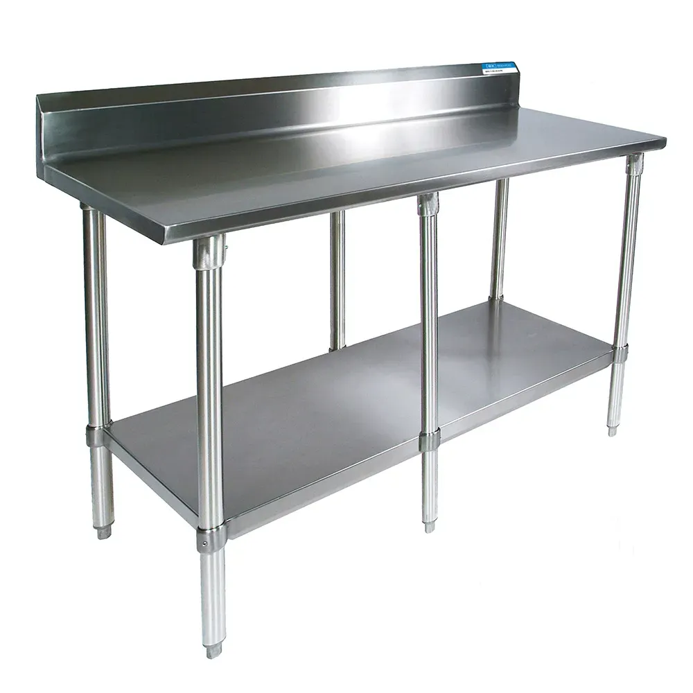 Elevate your culinary experience with the BK Resources SVTR5-8430 Work Table. This stainless steel work table is designed to meet the demands of a commercial restaurant setting. With its 84"W x 30"D size, it provides ample space for food preparation, making it perfect for busy kitchens. The 18/430 stainless steel top with turndown edges on the front and sides ensures durability and easy cleaning, while the reinforced channels add extra strength. The 5" backsplash helps to prevent spills and messes, keeping your workspace clean and organized. The adjustable stainless steel undershelf provides additional storage space for utensils, ingredients, and equipment. Equipped with six 1-5/8" dia. stainless steel legs and stainless steel bullet feet, this work table offers stability and support. NSF certified, this work table meets the highest standards of cleanliness and sanitation. Trust BK Resources to deliver a reliable and functional work table for your commercial restaurant needs.