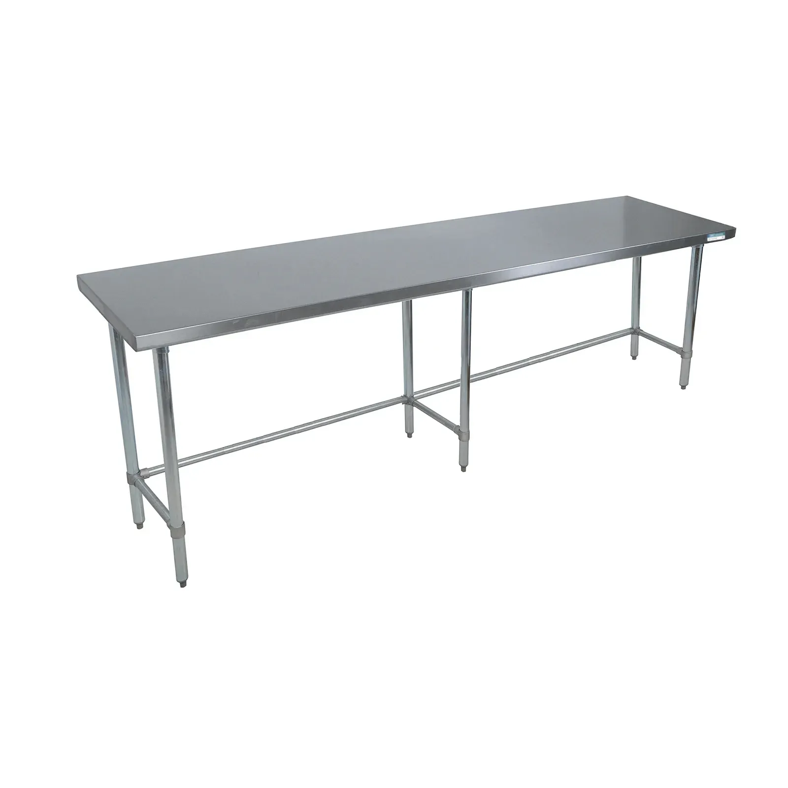 Empower your kitchen staff with the BK Resources VTTR5OB-8430 Work Table. This durable and versatile work table is designed to meet the demands of a busy commercial restaurant. The 18/430 stainless steel top with turndown edges on the front and sides provides a sturdy and easy-to-clean surface for food preparation. The table is reinforced with channels and features a 5" backsplash to prevent spills and messes. The open base with galvanized side and rear bracing ensures stability and durability, even in a high-traffic kitchen. The 1-5/8" dia. galvanized legs are adjustable, allowing you to customize the height to suit your needs. With its high impact corrosion resistant feet, this work table is built to withstand the rigors of a commercial kitchen. Trust BK Resources to deliver quality and reliability with the VTTR5OB-8430 Work Table.